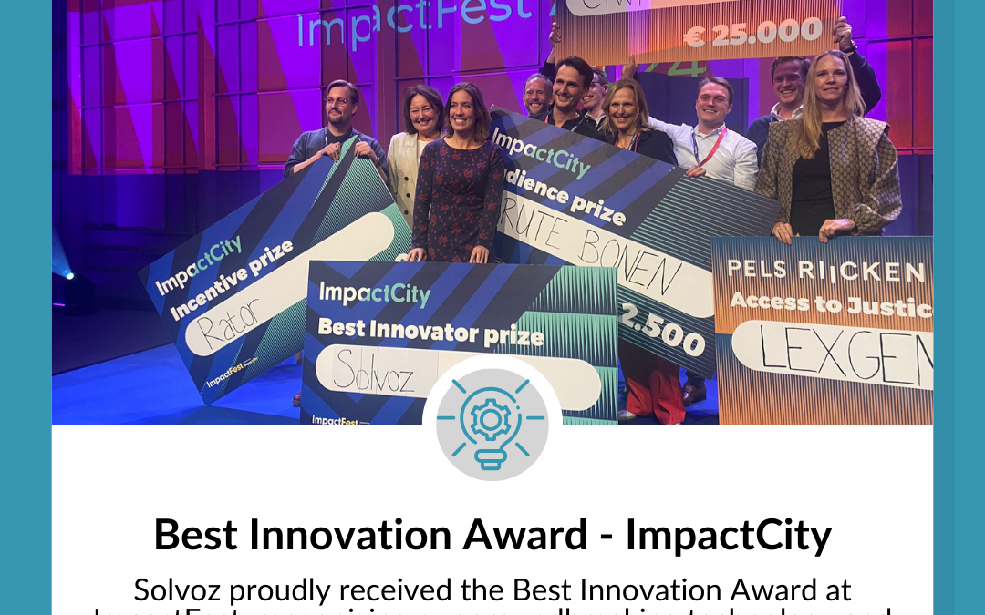 In 2024, Solvoz proudly received the Best Innovation Award at ImpactFest, an annual event organised by ImpactCity that brings together innovators and entrepreneurs to collaborate on solutions to urgent global challenges.