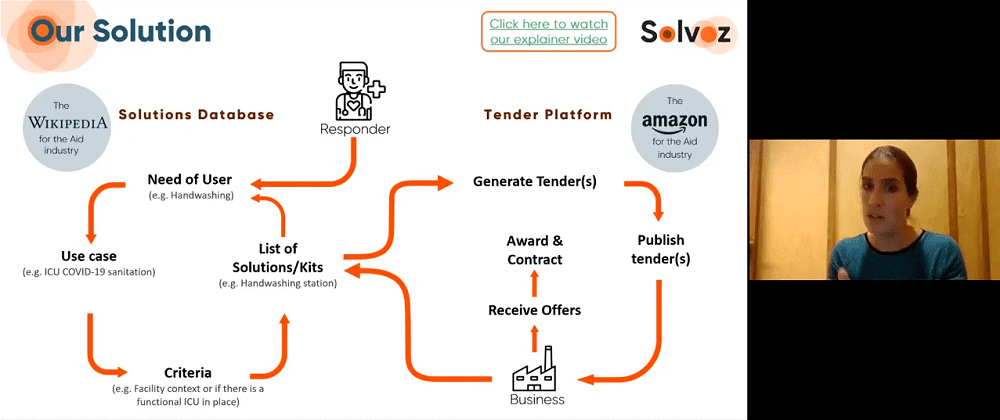 The presentation of entrepreneurs kicked off with Claire Barnhoorn, explaining her humanitarian journey. From university, to MSF logistician, to digital humanitarian; all leading to founding Solvoz. Addressing several core problems requiring system change. Poor knowledge how solutions work, low visibility of local solutions, product dominated thinking, and complexity of markets and context. After that, she discussed Solvoz.